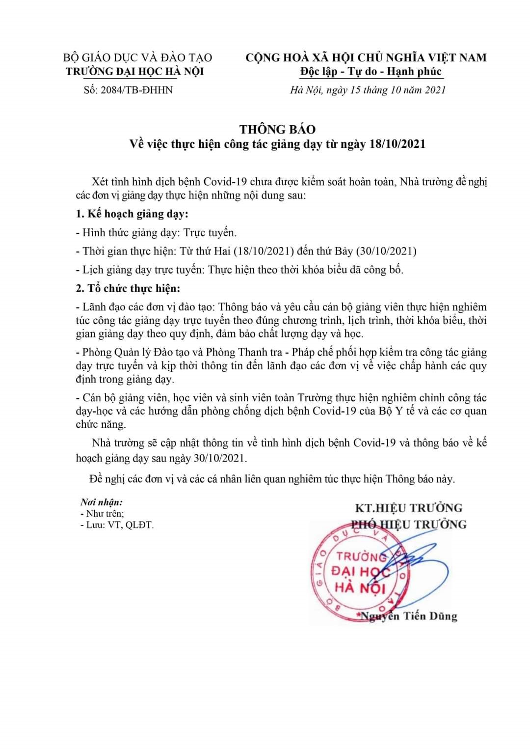 Trường Đại học Hà Nội thông báo về việc tiếp tục thực hiện công tác giảng dạy theo hình thức trực tuyến từ ngày 18/10/2021 đến ngày 30/20/2021.